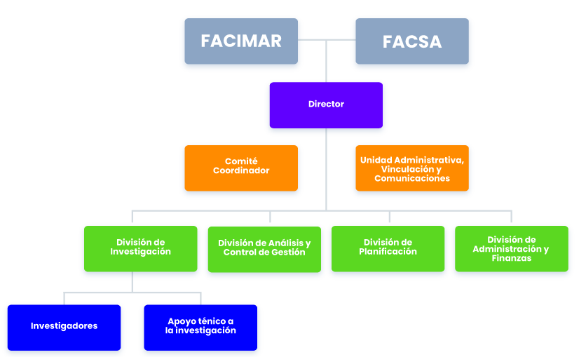 El CIIBBA será una plataforma dependiente y albergada en dos Facultades de la UA, FACIMAR y FACSA y estará organizado administrativamente como se muestra en la Figura 1. Estará dirigida por un Director(a), quien estará asesorado por el Comité Coordinador y se contará con una Unidad Administrativa, Vinculación y Comunicaciones, como también con diferentes Divisiones para el buen funcionamiento del Centro, que incluyen: la Divisiónde Investigación; la División de Análisis y Control de Gestión; la División de Planificación; yla División de Planificación y Finanzas.